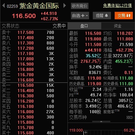 【大河财立方消息】9月30日,紫金黄金国际港股上市。开盘1分钟,紫金黄金国际股价大涨62.73%泸深策略,总市值突破3000亿港元。该公司在公开发售阶段获240.74倍认购,国际配售阶段获20.38倍认购。